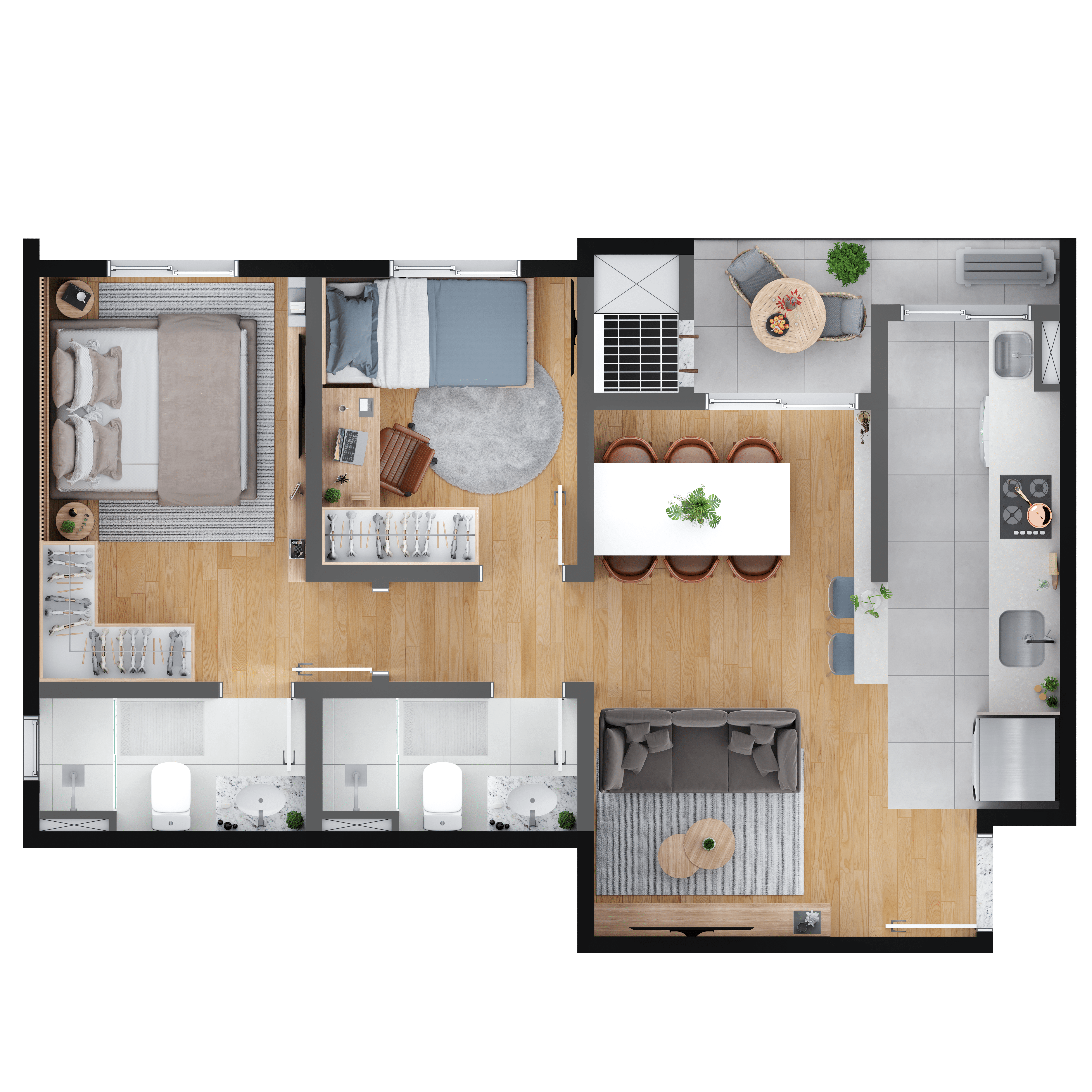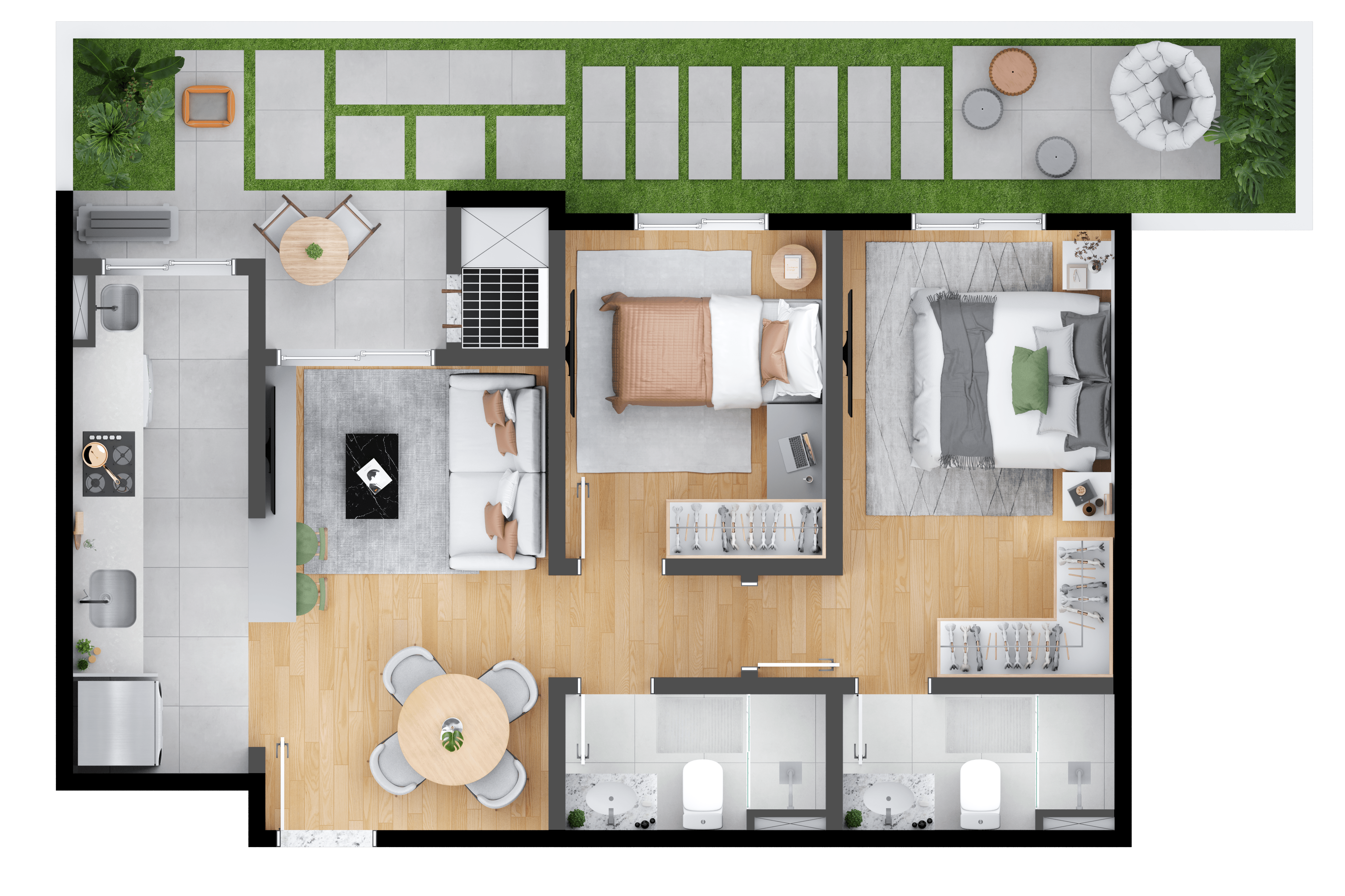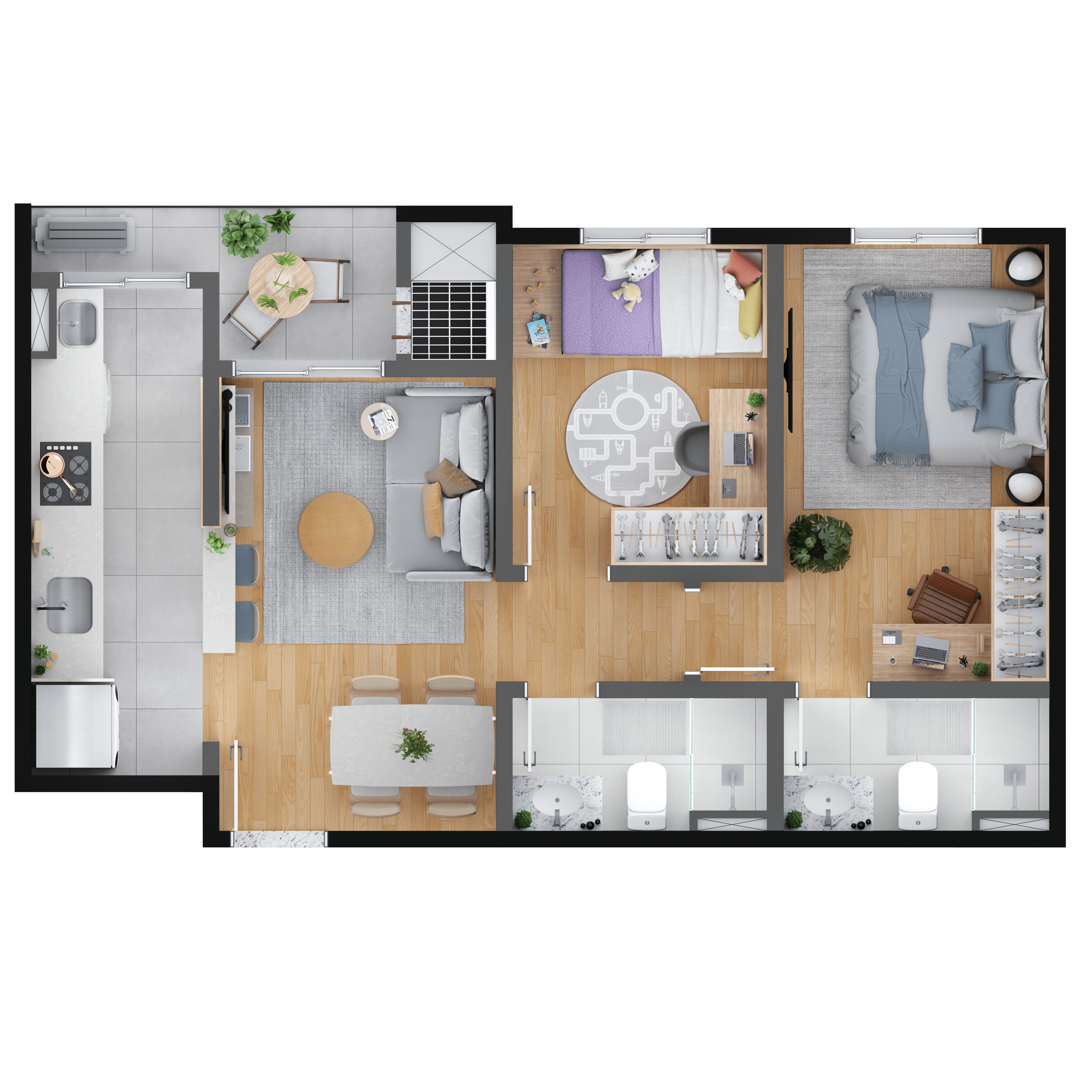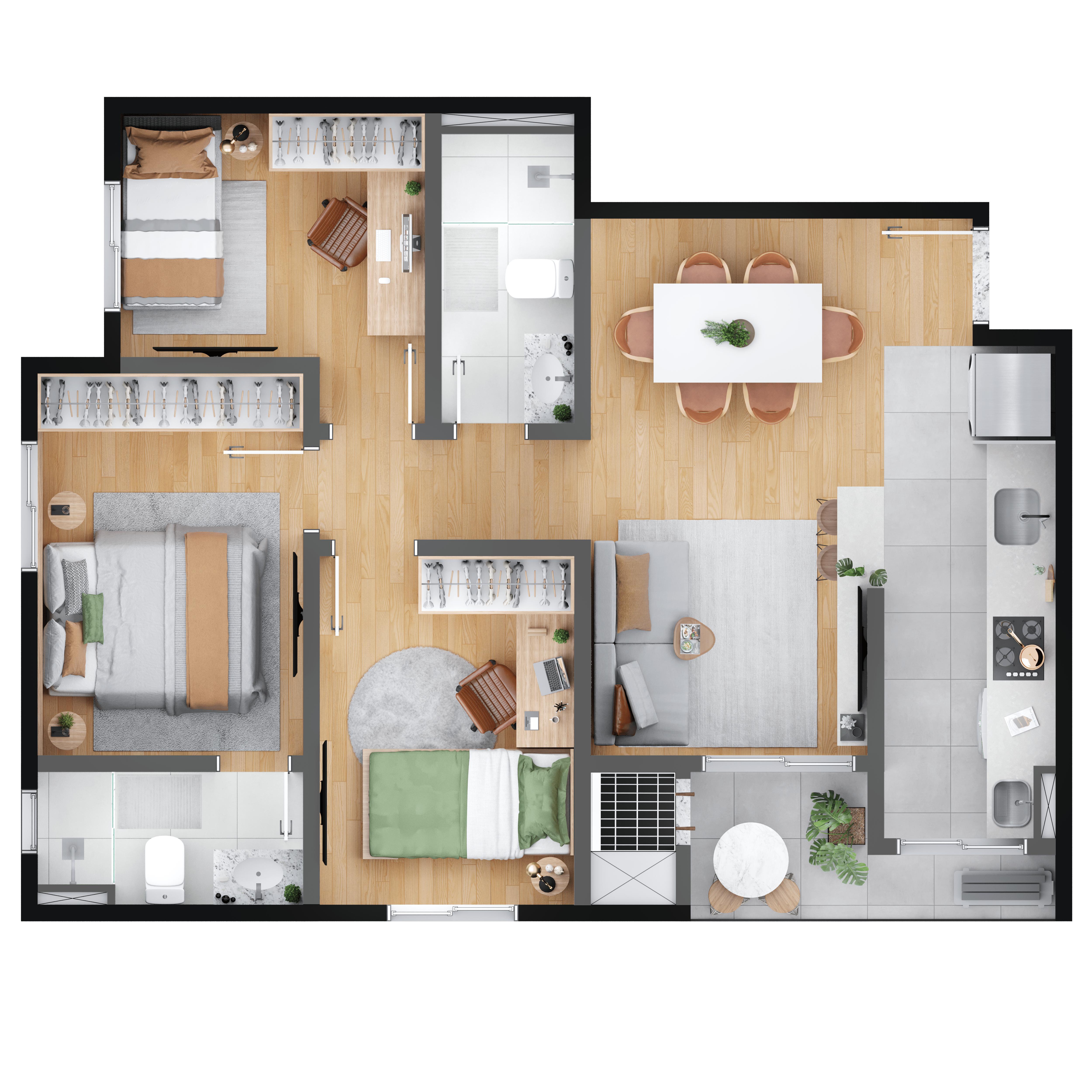 O MEO Neoville possui opções de plantas 2 ou 3 quartos, 1 suíte, garden e churrasqueira a carvão nas sacadas. Escolha a que mais combina com seu estilo de vida.