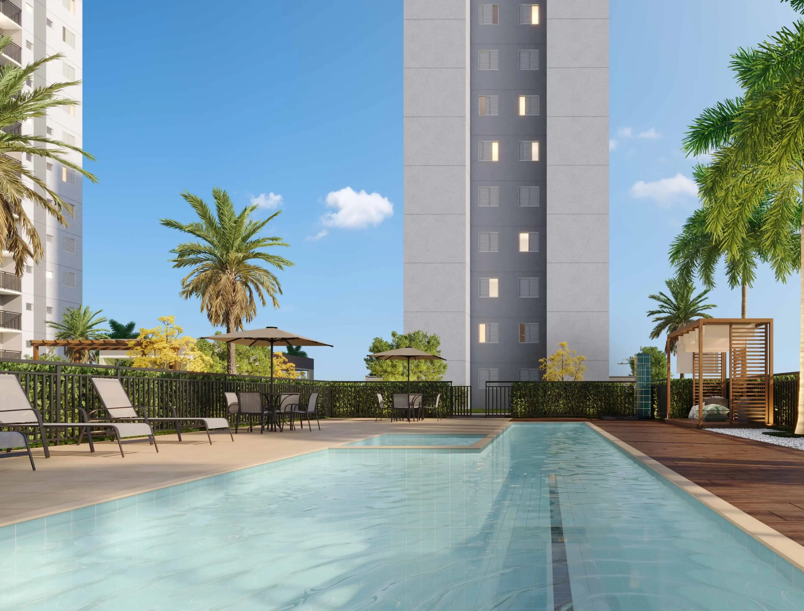 A área de lazer inclui piscina com raia, espaço churrasco, academia, quadra e ambientes temáticos como LongiBeach e LongiGolf. O conjunto forma um condomínio moderno, com a qualidade e o padrão da Longitude.