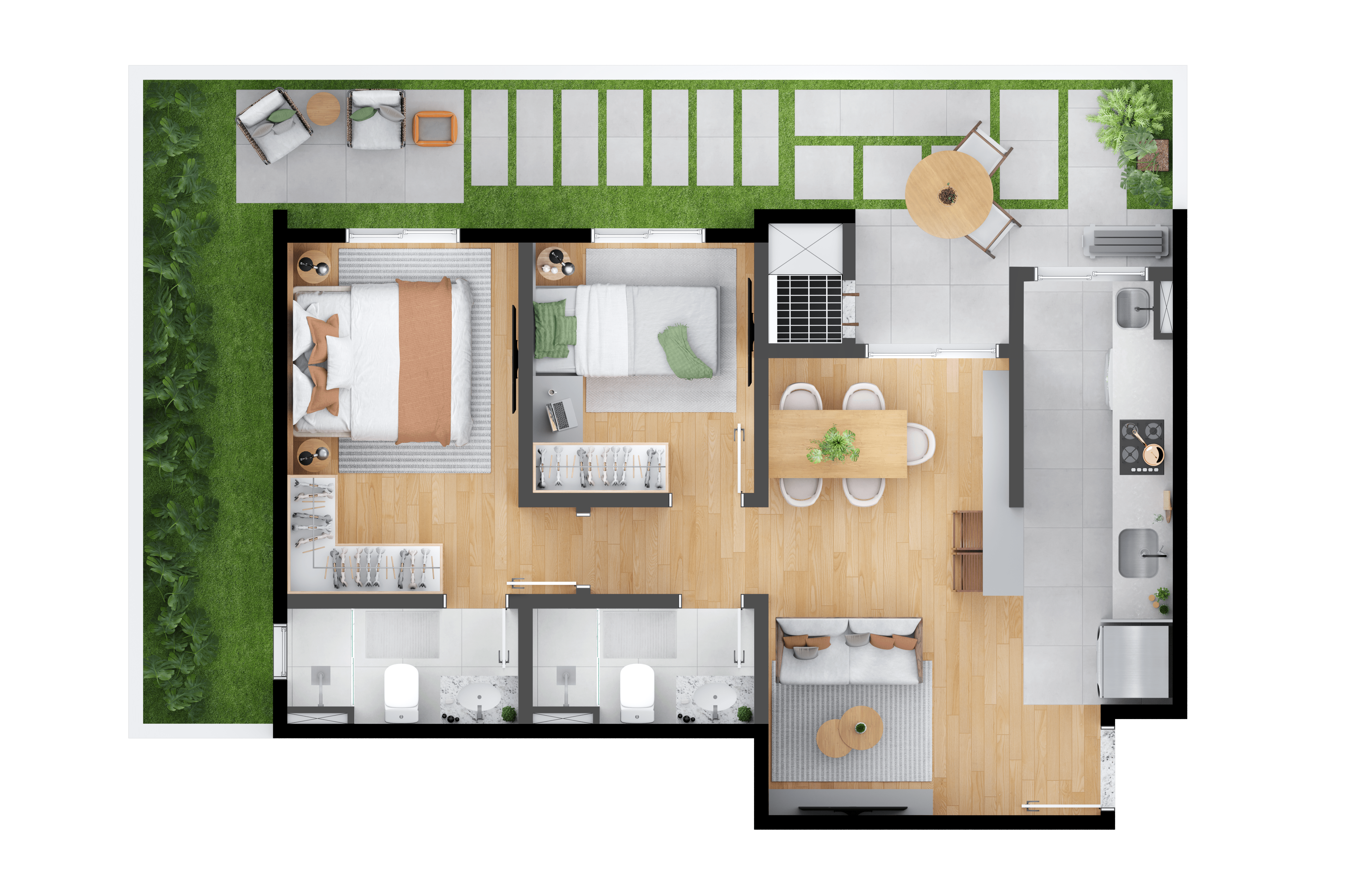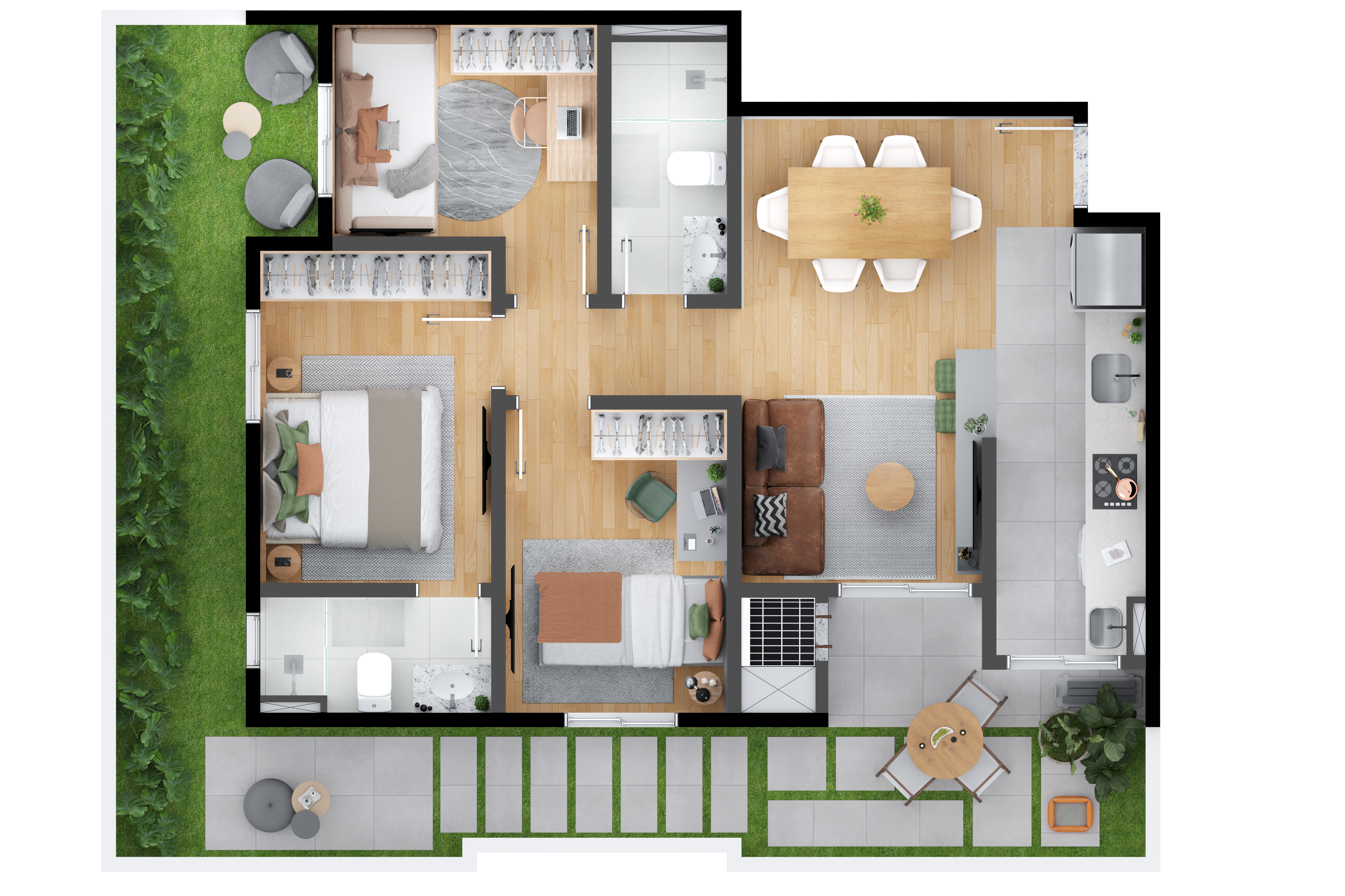 O MEO Neoville possui opções de plantas 2 ou 3 quartos, 1 suíte, garden e churrasqueira a carvão nas sacadas. Escolha a que mais combina com seu estilo de vida.