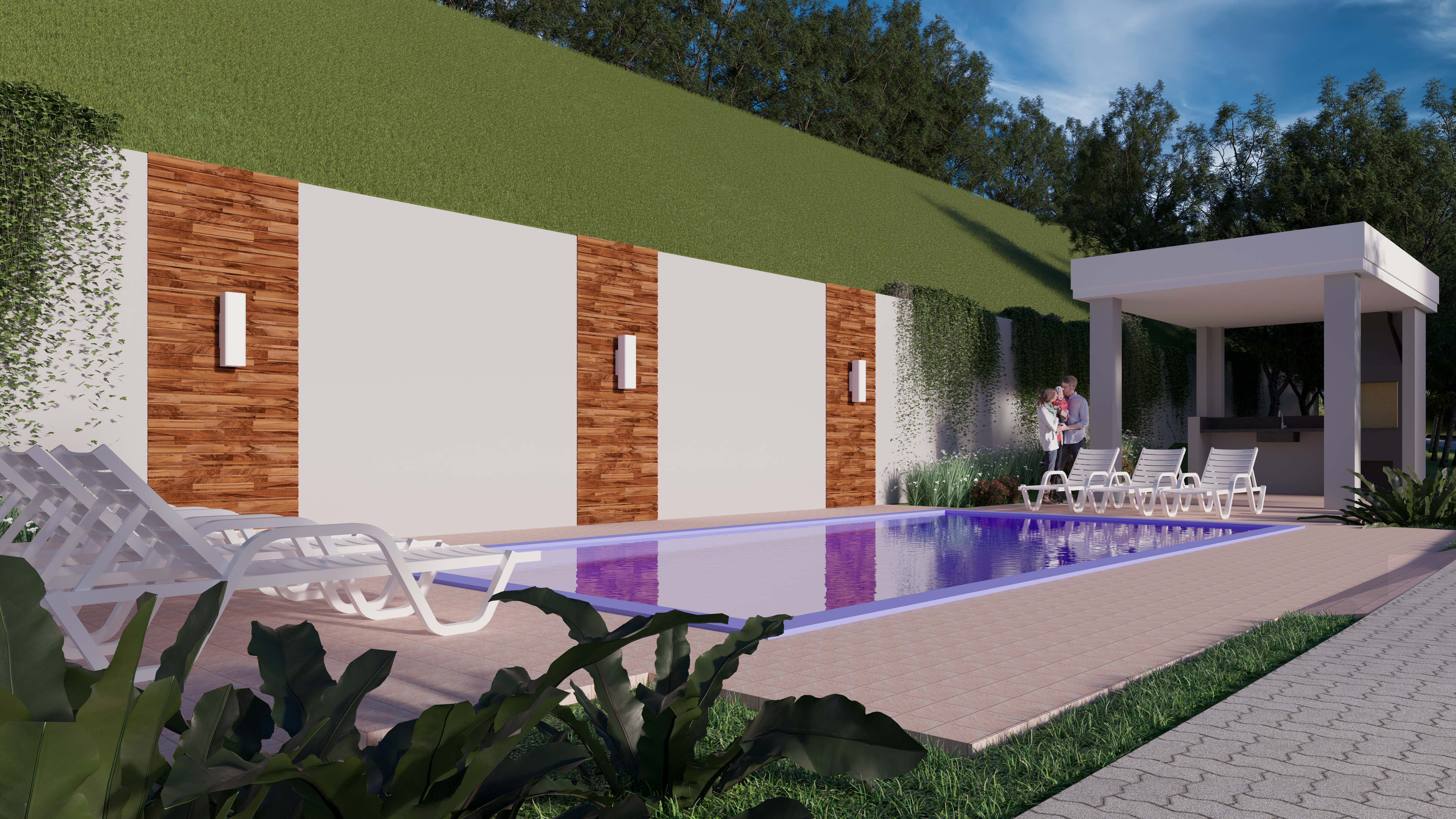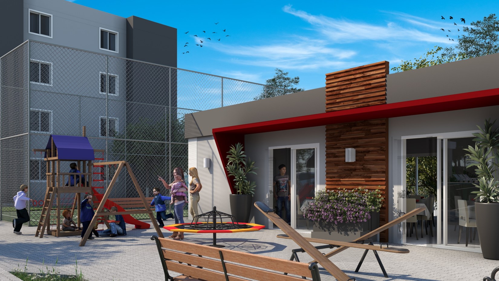 Apartamento de 47m², com dois quartos, cozinha, banheiro, sala de estar, sala de jantar, lavanderia e varanda gourmet com churrasqueira à carvão.