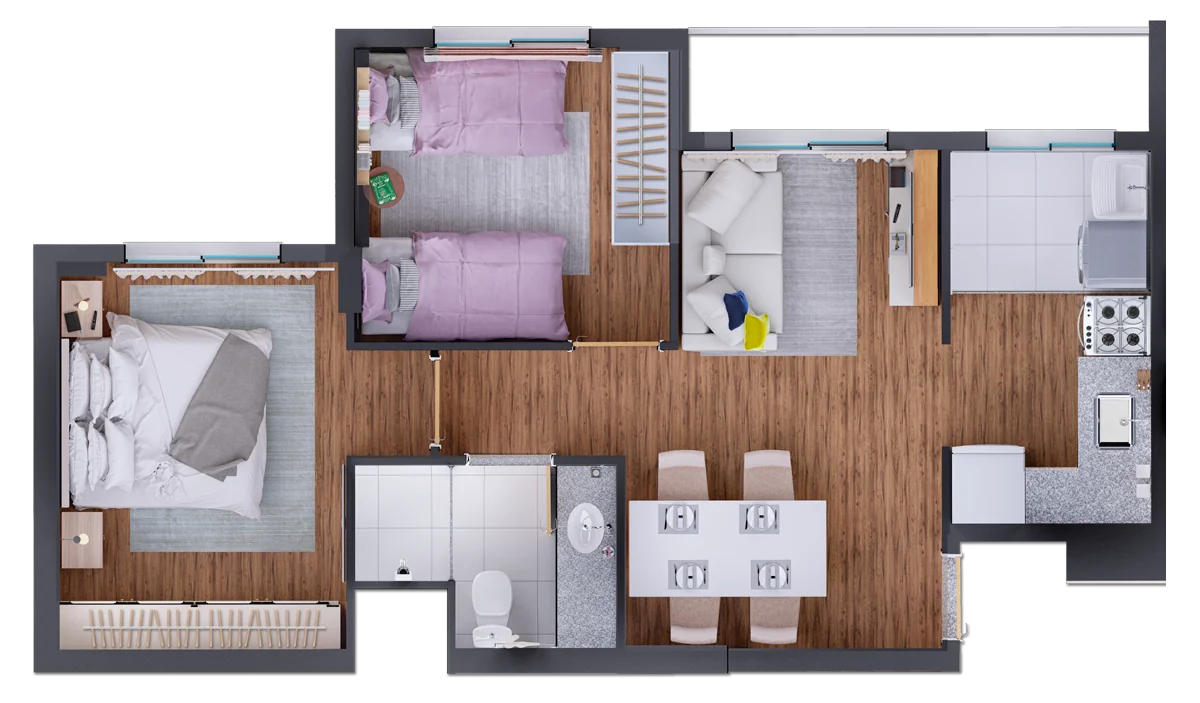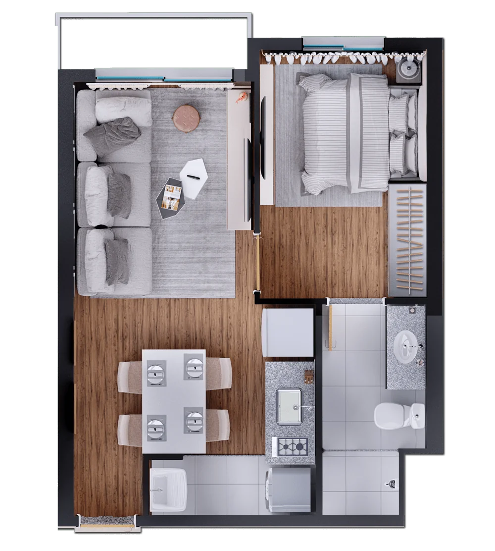 O empreendimento conta com dois tipos de planta, podendo ser de 1 quarto (35m2) ou 2 quartos (51m2).